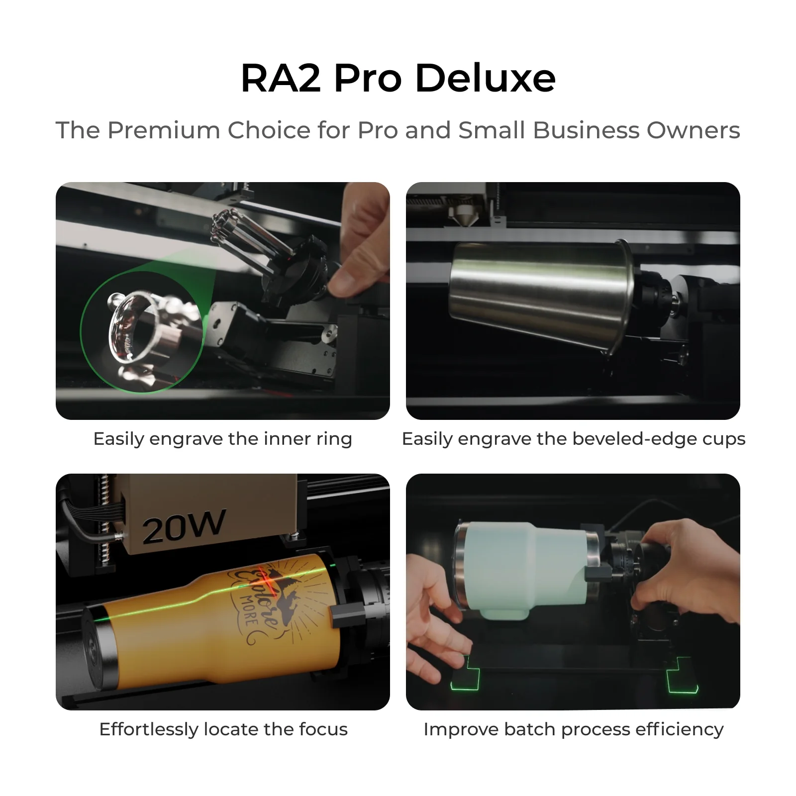 El RA2 Pro es el primer accesorio rotativo 4 en 1 para máquinas de grabado láser, diseñado para ampliar las capacidades de grabado a objetos cilíndricos, esféricos, anillos y tazas.